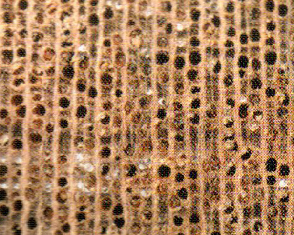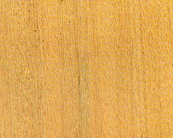 光澤弱。紋理略交錯;結(jié)構(gòu)略粗,均勻;重量、硬度、強度中等:干縮小。加工容易,切面光滑;含硅石,刀具易鈍:油漆、膠黏、拋光性能好; 握釘力強。略耐腐。干燥很慢,有開裂、輕微翹曲、杯彎缺陷。氣干密度約0.6 g/cm3。